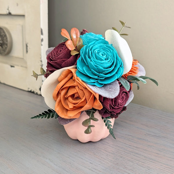 Peach pumpkin with sola wood flowers in assorted colors and faux greenery.