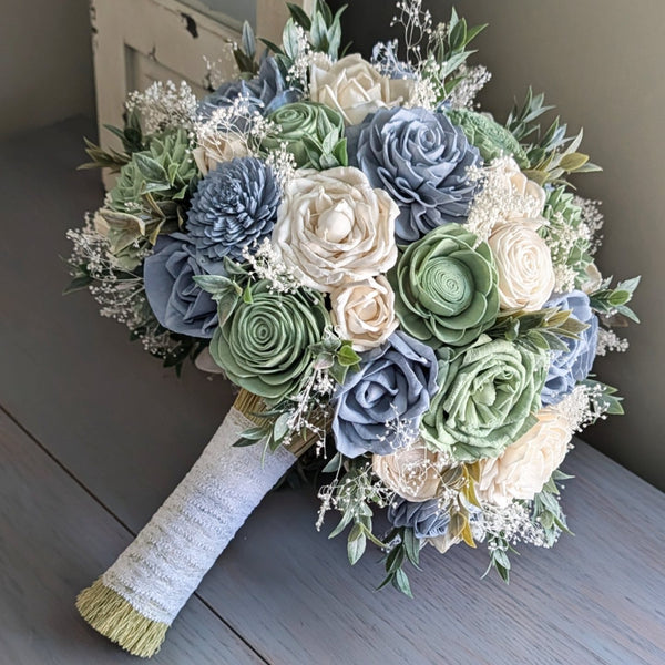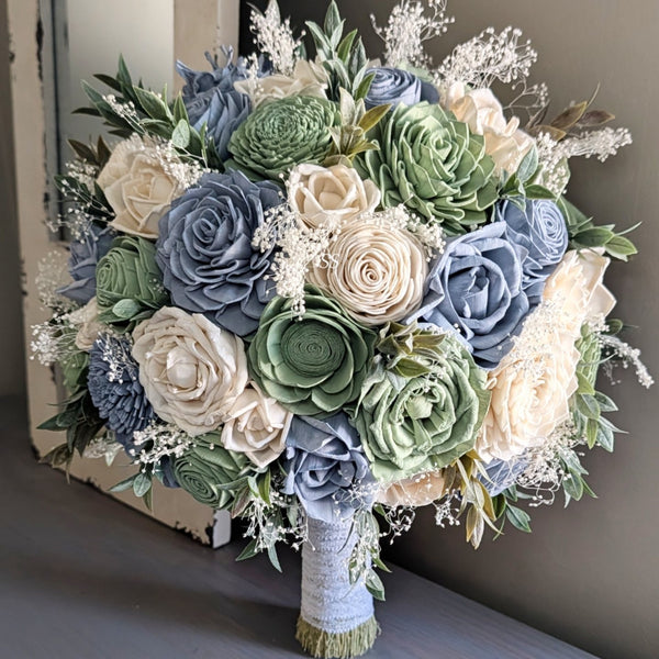 Bouquet with sola wood flowers in dusty blue, sage, and ivory, with baby's breath and faux greenery. Flower styles can and will vary based on current inventory levels and to keep orders unique, so they are not exact duplicates.