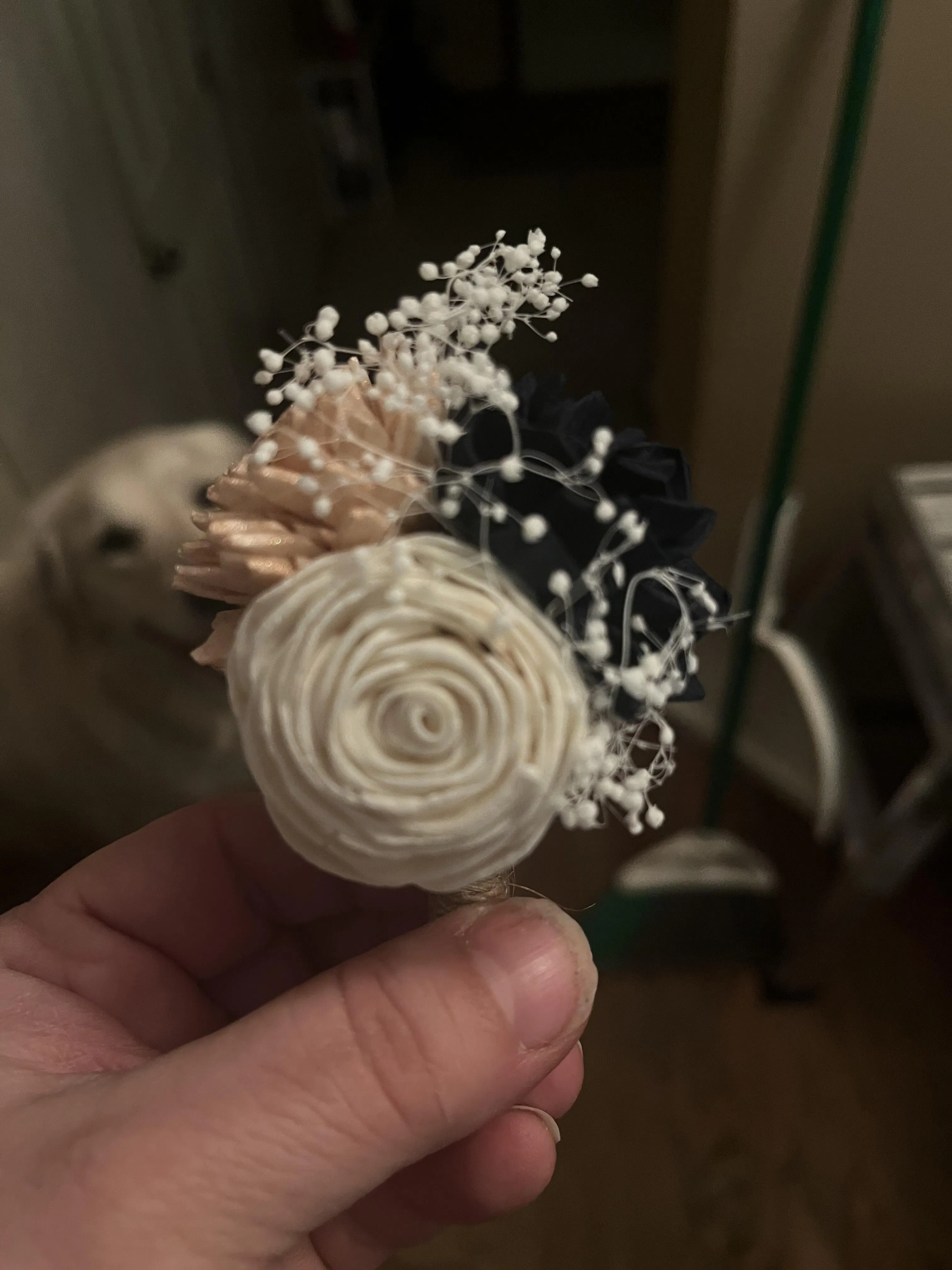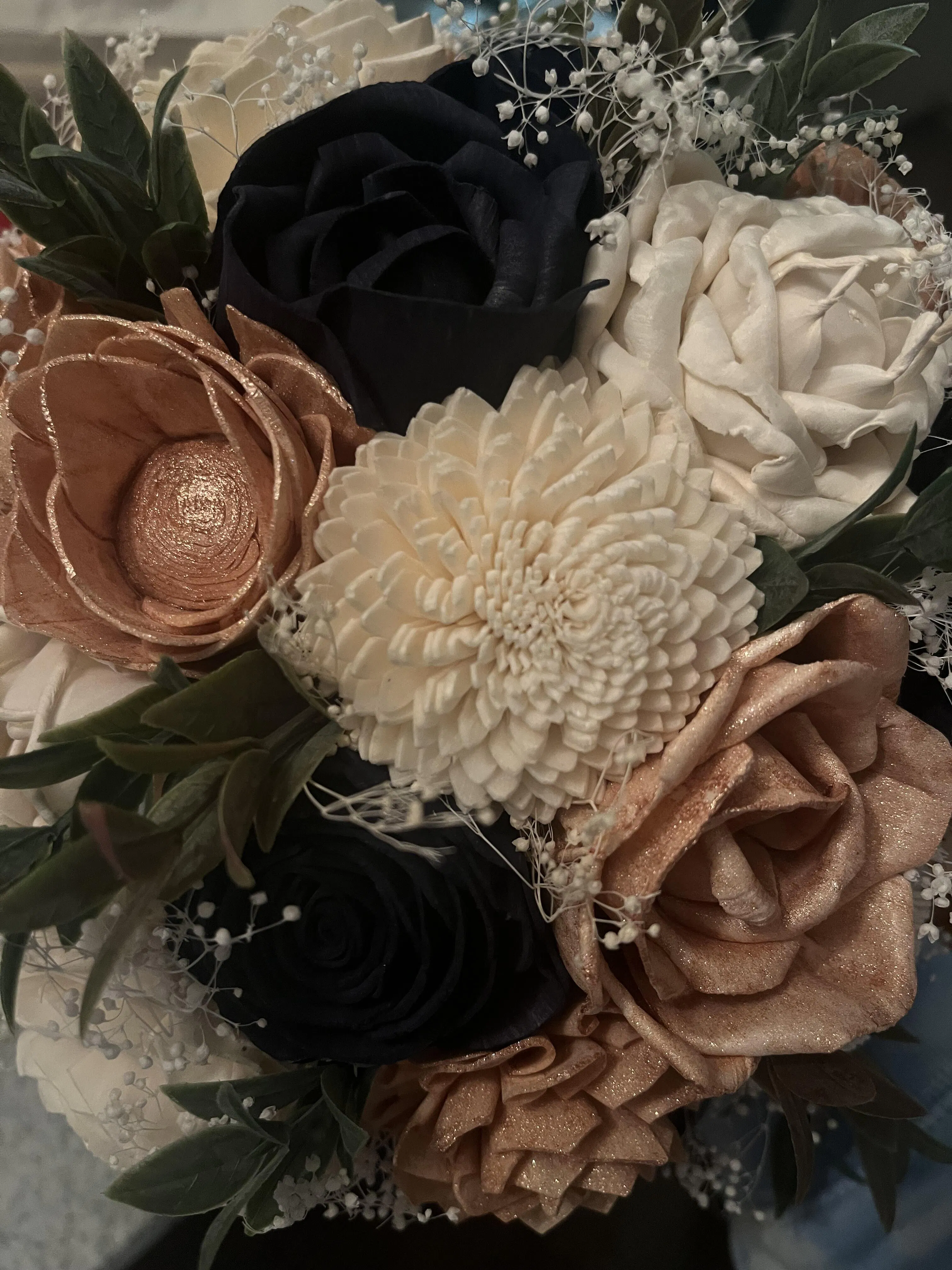 Bought the navy, rose gold, and cream small bouquet for my upcoming wedding. Pleasantly surprised that the rose gold is shimmery! The bouquet is beautiful and well crafted!