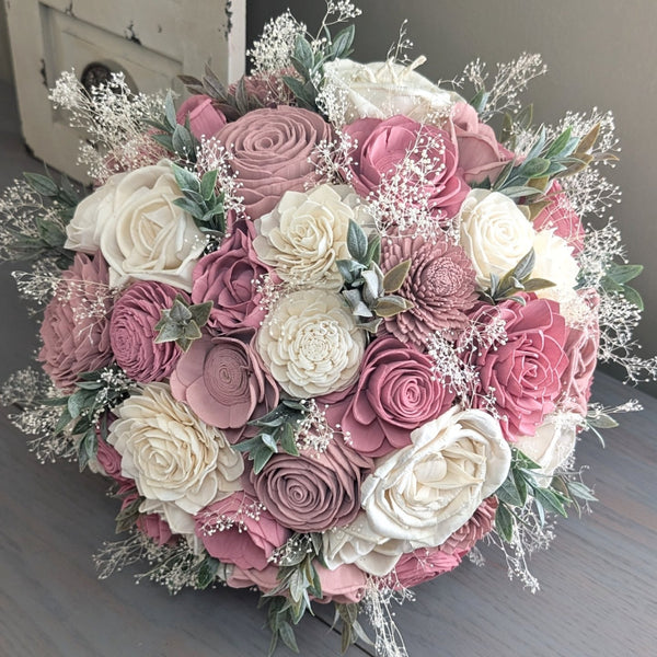 Bouquet with sola wood flowers in pinkish mauve, dusty rose, and ivory, with baby's breath and faux greenery. Flower styles can and will vary based on current inventory levels and to keep orders unique, so they are not exact duplicates.